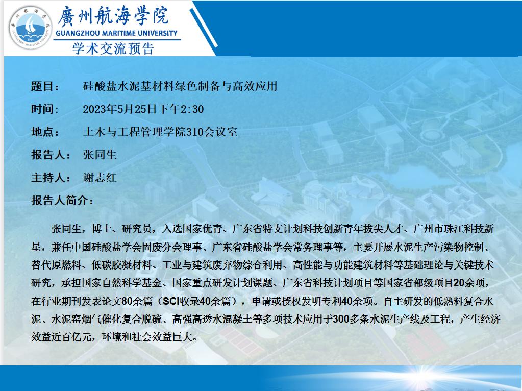 张同生教授学术讲座预告:硅酸盐水泥基材料绿色制备与高效应用