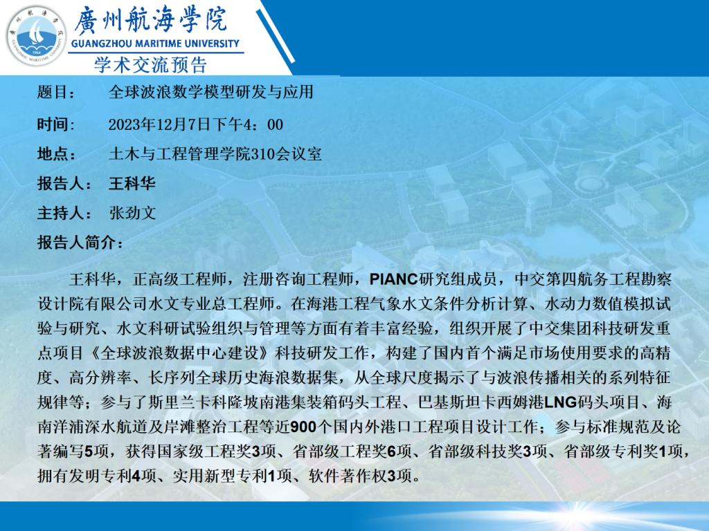 学术讲座预告——王科华总工程师《全球波浪数学模型研发与应用》