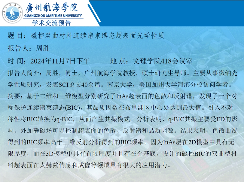 深蓝论坛学术讲座预告:周胜《磁控双曲材料连续谱束缚态超表面光学性质》