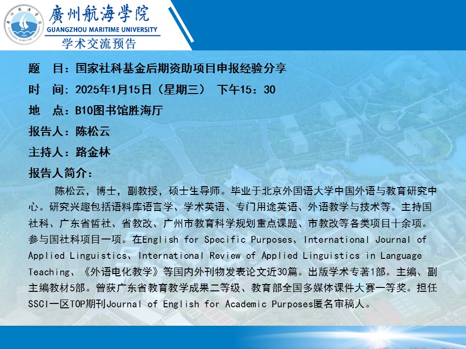 学术讲座预告:陈松云《国家社科基金后期资助项目申报经验分享》