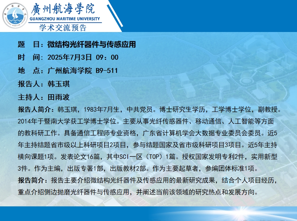 学术讲座预告:韩玉琪《微结构光纤器件与传感应用》