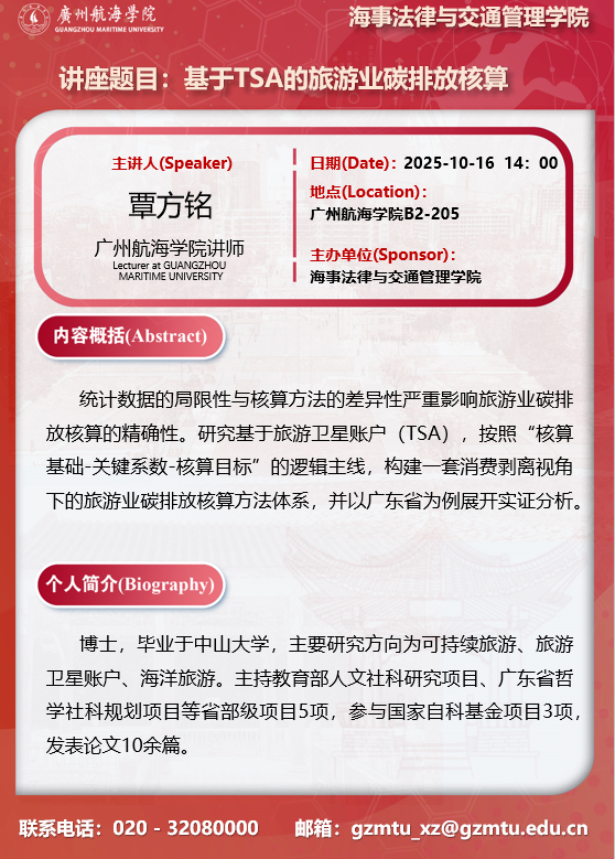 学术讲座预告:覃方铭《基于TSA的旅游业碳排放核算》